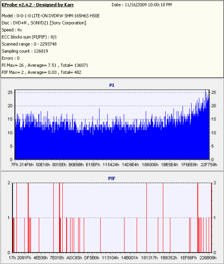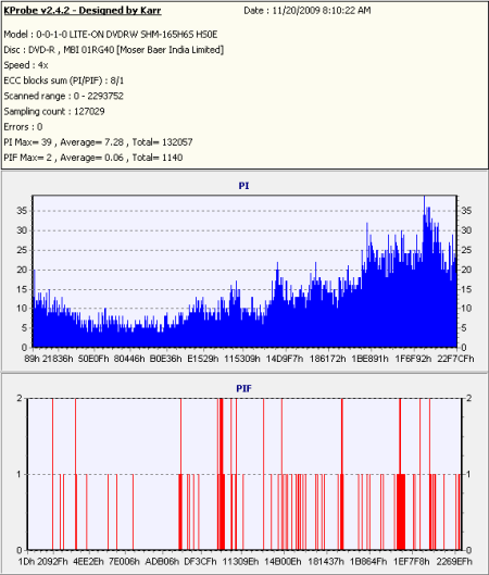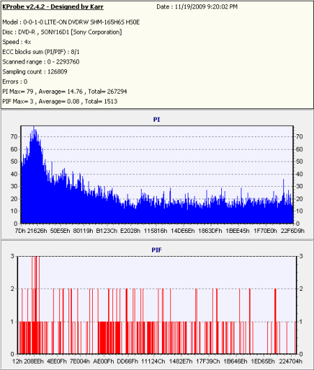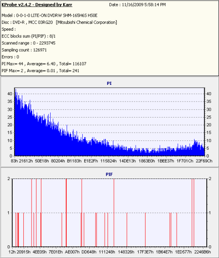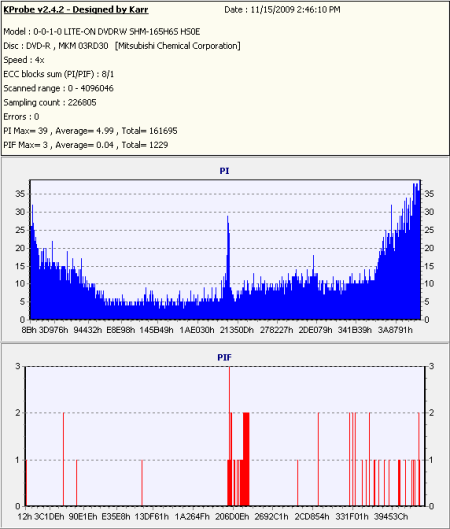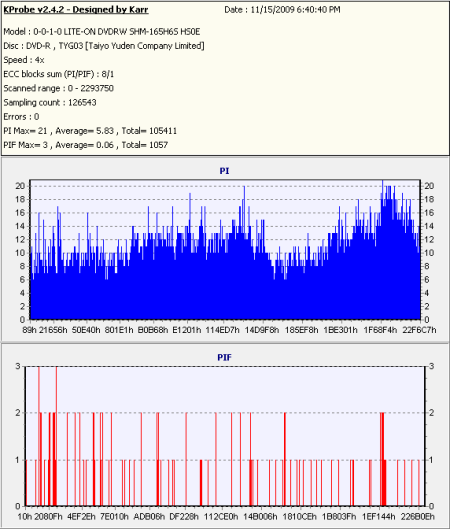 So what about writing quality? Thanks to KProbe, we can test a disc's PI (Parity Inner) and PIF (Parity Inner Fail) rates. For these tests I used a Lite-On SHM-165H6S (firmware HS0E) and read the discs at 4x with the PI and PIF ECC sums set to 8 and 1 respectively. For comparison, I also tested the discs on a BenQ DW1640. When combined with Nero CD Speed, the DW1640 is able to report PI Errors, PI Failures, Parity Outer Failures and even jitter levels. For this test, the discs are read at 8x with both the PI and PIF ECC sums set to 8.