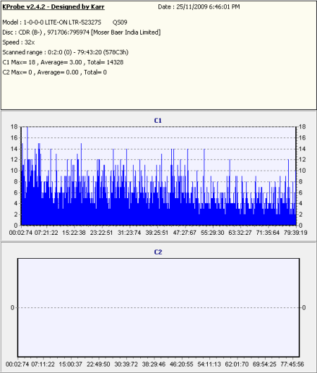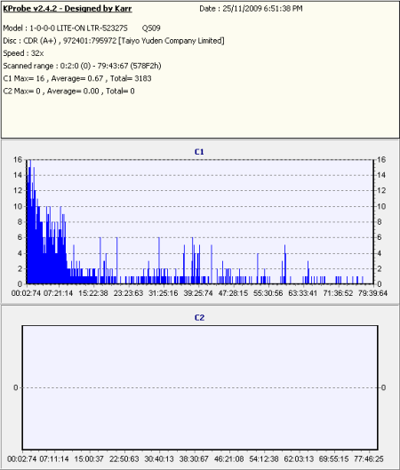 So what are "good" results supposed to look like? With KProbe, the PI errors should not exceed 280 and the number of PIF errors should stay below 4. When testing with CD Speed, the number of PI errors should stay below 280 as well. However, because it scans with an ECC sum of 8, a higher number of PIF errors is acceptable, as long as they do not exceed 32. Since POF errors are uncorrectable, we really don't want to see any of them at all.