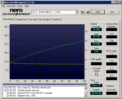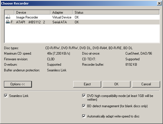 Nero also shows that the iHBS112 has a maximum CD writing speed of 48x and a 2048KB buffer. This buffer is backed up by Seamless Link buffer underrun protection as well. According to Nero, the iHBS112 can also write CD-Text and overburn. When testing the drive's capacity, it had no problems overburning up to 99 minutes with our CompUSA media.