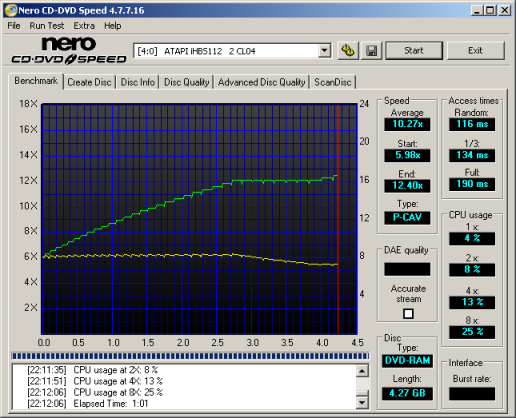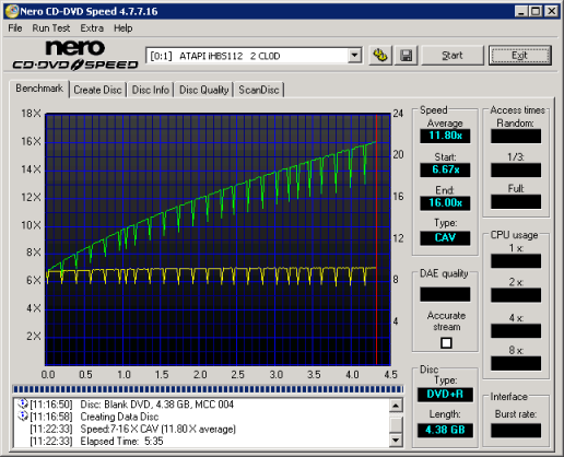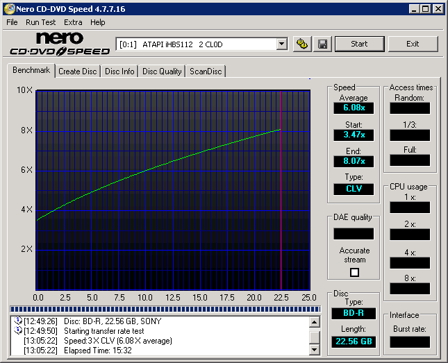 The iHBS112 is the first drive from Lite-On that can write to BD-R media at 12x. By looking at the screenshot above, you can see that Lite-On's new drive starts writing at about 5.2x and accelerates, reaching its maximum speed at the end of the disc.
