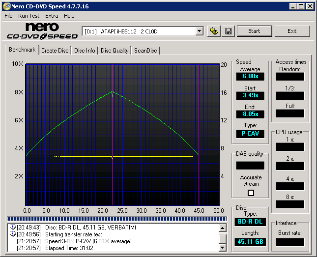 | Verbatim 25GB 2x BD-RE | VERBATIM0 | 2x | 44:49 | Transfer Rate |