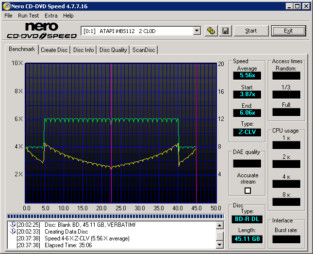 BD Read Tests: For the read performance section of the BD benchmarks, CD Speed v4.7.7.16 is used to test read speeds, access times, and CPU usage.