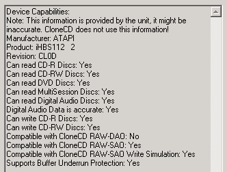 Here is a screen shot from Erik Deppe's Opti Drive Control. Among other things, this program queries the drive to see what its reading and writing capabilities are. Opti Drive Control had no problems detecting the iHBS112's reading and writing speeds and supported disc types.