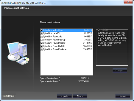 From here you can choose to install the InstantBurn, LabelPrint, Power2Go, PowerBackup, PowerDirector, PowerDVD or PowerProducer . To complete the installation, select the components you want and click next a few more times. Once the files are copied over, you can start burning your own discs.