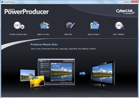 CyberLink PowerProducer 5 - With CyberLink's PowerProducer you can create your own movie discs quickly and easily. Right from the start, this wizard based software gives you a number of options to select from. From here you can choose to produce a new movie disc, edit an existing one or record video directly to DVD or BD.