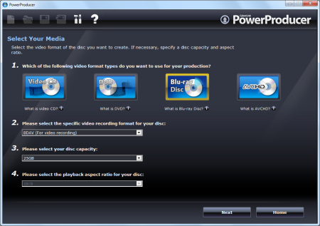 PowerProducer lets you create a number of different movie discs. Looking at the menu below, you can choose to create a CD, DVD, or Blu-ray Disc. The software also supports various disc capacities and formats including DVD-VR, DVD+VR and BDAV.