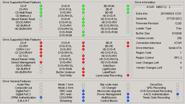 While Opti Drive Control gives us a quick glance at the iHBS112's features, DVDINFOpro provides a little more information on some of the drive's reading and writing capabilities. By looking at the screenshot above you can see that Lite-On's new drive can read and write to most BD and DVD formats.