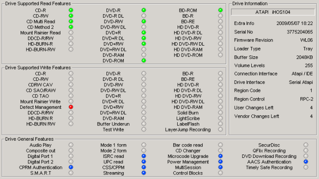 Nero InfoTool can be used to query the drive to see what its reading and writing capabilities are. According to InfoTool, the iHOS104 has a maximum CD read speed of 32x and an 2MB buffer.