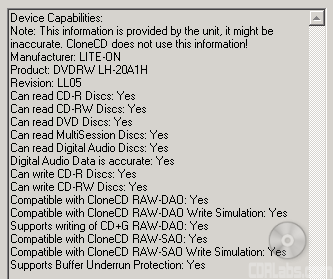 Here is a screen shot from Nero's InfoTool. This program queries the drive to see what its reading and writing capabilities are. InfoTool had no problems detecting the LH-20A1H's maximum reading and writing speeds, recording modes, buffer underrun protection and 2MB buffer.