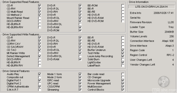 While InfoTool gives us a quick glance at the LH-20A1H's features, DVDINFOpro provides a little more information on some of the drive's reading and writing capabilities. By looking at the screenshot above you can see that while Lite-On's new drive can read and write to DVD+R DL, DVD-R DL and DVD-RAM media, it does not support the Mt. Rainier format.