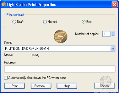 Once you've created your LightScribe label, you're ready to print it. Before you can do this though, you will need to choose the contrast. Keep in mind this option not only changes the level of detail, it also affects the amount of time it takes to print the label. The higher the quality, the longer the process will take.
