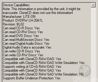 Here is a screen shot from Nero's InfoTool. This program queries the drive to see what its reading and writing capabilities are. InfoTool had no problems detecting the LH-20A1L's maximum reading and writing speeds, recording modes, buffer underrun protection and 2MB buffer.