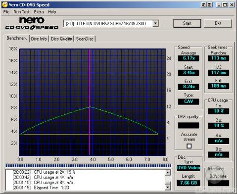 When reading single layer DVD videos, the SOHW-1673SU reached a maximum transfer speed of 16.08x. While not as fast as the drive from Plextor, this is still quite good. Lite-On's new drive was also fairly quick when reading dual layer discs. By looking at the screenshot below, you can see that the drive's transfer speeds peaked at about 8.24x.
