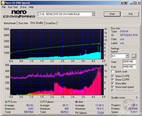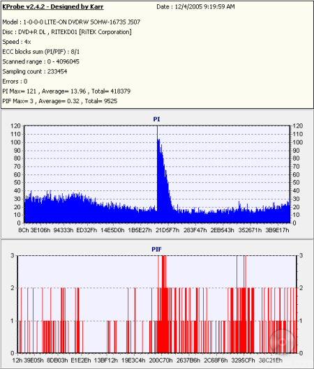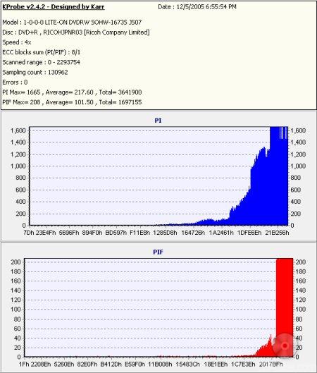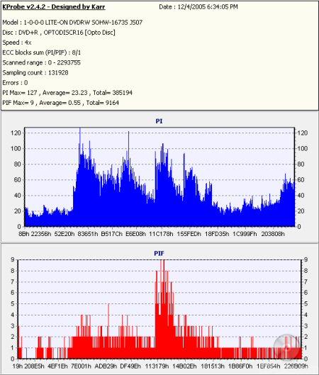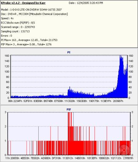 So what about writing quality? Testing a drive's DVD writing quality isn't easy. Until now, there were very few options, unless you wanted to shell out thousands of dollars for a certified test machine. Thanks to KProbe, we can test a disc's PI (Parity Inner) and PIF (Parity Inner Fail) rates.For these tests I used a Lite-On SOHW-1673S (firmware JS07) and read the discs at 4x with the PI and PIF ECC sums set to 8 and 1 respectively. For comparison, I also tested the discs on a BenQ DW1640. When combined with Nero CD Speed, the DW1640 is able to report PI Errors, PI Failures, Parity Outer Failures and even jitter levels. For this test, the discs are read at 8x with both the PI and PIF ECC sums set to 8.