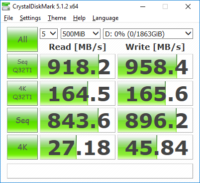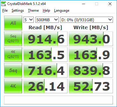 First, I ran a few quick tests using CrystalDiskMark. This benchmark tool measures the performance of a storage device by testing its sequential read and write speeds as well as its random read and write speeds using blocks 512K and 4K in size.