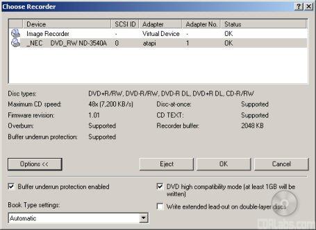 The Nero screenshot also shows that the ND-3540A has a maximum CD writing speed of 48x and a 2048KB buffer. This buffer is also backed up by some form of buffer underrun protection. According to Nero, the drive can also write CD-Text and overburn. Unfortunately, like some of the other NEC based DVD writers we've tested, it wasn't able to recognize our 99 minute CompUSA discs at all.