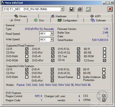 InfoTool also shows that the ND-3540A is a RPC-2 DVD drive. This means that the drive's region is stored in the firmware. The drive's region can be changed five times and after that it cannot be changed anymore. A patched RPC-1 firmware can be downloaded here. Just keep in mind that it is not supported by NEC nor by CDRLabs. Use it at your own risk.