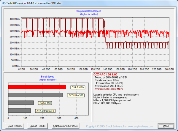 Looking at the screenshot above, you can see that the ARC 100 had average read and write speeds of 289.1 MB/s and 310.0 MB/s respectively, as well as a burst speed of 339.8 MB/s.