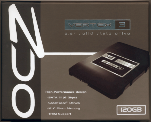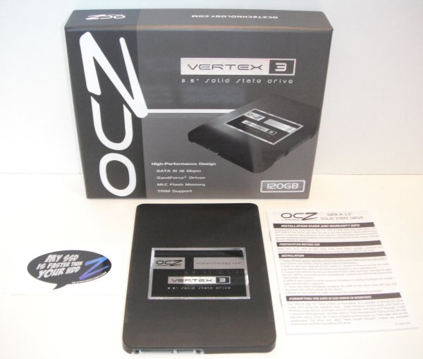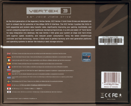 The Vertex 3 3.5" comes in a small, black and gray box. Along with a picture of the drive, the front advertises many of its key features including its 120GB capacity, SATA 6Gbps interface, SandForce controller, MLC flash memory and TRIM support. The back of the box provides a bit more information regarding the Vertex 3's features and capabilities. Inside, you'll find the SSD, an installation guide and a sticker that says "My SSD Is Faster Than Your HDD."