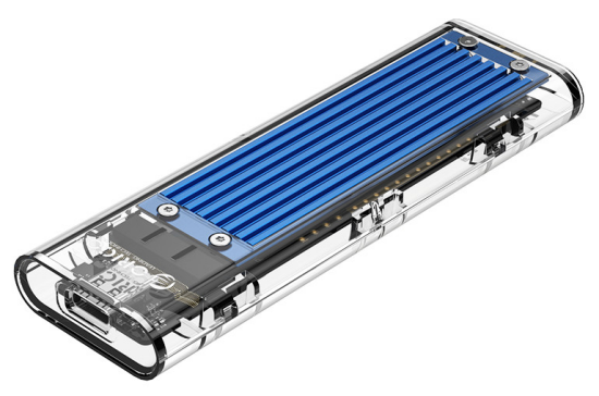 The enclosure's shell is made almost entirely out of transparent plastic. This not only protects your SSD, it makes it easy to identify the drive inside. The enclosure also has an aluminum heat sink along one of the sides. Available in a variety of colors, this finned heatsink works to dissipate heat away from your drive. I do need to point out that this heatsink can get quite warm. With Samsung's 970 EVO SSD, temperatures averaged around 110°F at idle but jumped to 138°F under heavy loads.
