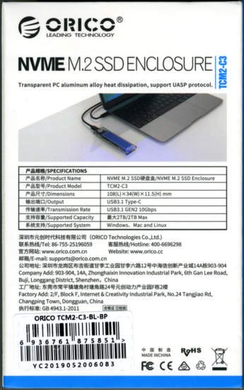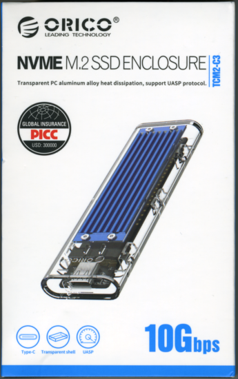Orico's transparent NVMe enclosure comes in a small blue and white box. Along with a picture of the enclosure, the front advertises many of its key features including its USB Type-C port, transparent shell, and its support for UASP. The back of the box provides a bit more information regarding the enclosure's features and specifications.