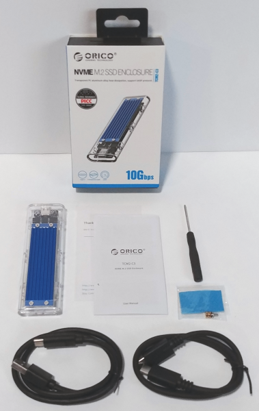 Inside the box you'll find the enclosure as well as a USB-C to A cable, USB-C to C cable, a couple of silicone thermal pads, a mounting screw, mini screwdriver and a small user manual.