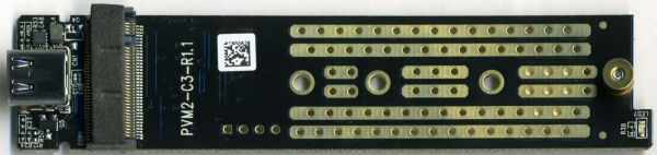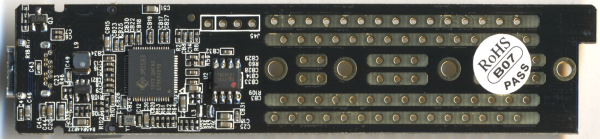 Inside the enclosure, there is a small printed circuit board (PCB). On the top of the board, you'll find an M.2 slot as well as a series of holes that let you mount SSDs 80mm, 60mm, 42mm and 30mm in length. The PCB also has a number of doubled sided, copper strips that, like the heatsink, are designed to dissipate heat away from the drive.