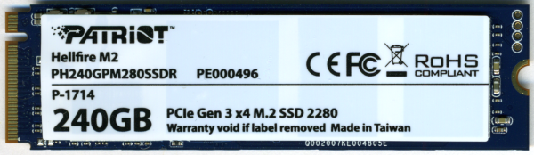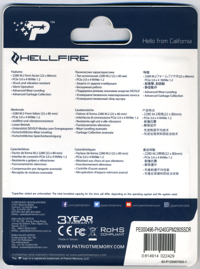 Instead of a box, the Hellfire comes packaged in a cardboard blister pack. The packaging advertises many of the drive's key features including its capacity, PCIe Gen3x4 interface, NVMe 1.2 support and three year warranty.