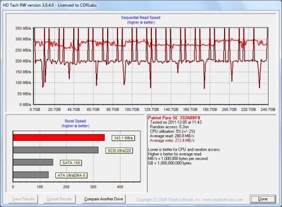 To see how well the Pyro SE could recover, I let the computer sit for a few hours and then reran the test. The drive's average read speed climbed up to 297.1 MB/s. However, its write speed still lagged a bit behind, averaging out at 266.7 MB/s.