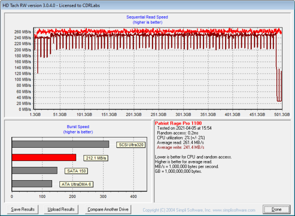 The Supersonic Rage Pro didn't perform quite as well when tested with HD Tach. This time around, the drive had average read and write speeds of 261.4 MB/s and 241.4 MB/s, respectively, as well as a burst speed of 212.1 MB/s.