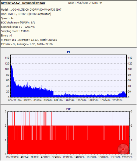So what about writing quality? Testing a drive's DVD writing quality isn't easy. Until now, there were very few options, unless you wanted to shell out thousands of dollars for a certified test machine. Thanks to KProbe, we can test a disc's PI (Parity Inner) and PIF (Parity Inner Fail) rates.For these tests I used a Lite-On SOHW-1673S and read the discs at 4x with the PI and PIF ECC sums set to 8 and 1 respectively. For comparison, I also tested the discs on a BenQ DW1640. When combined with Nero CD Speed, the DW1640 is able to report PI Errors, PI Failures, Parity Outer Failures and even jitter levels. For this test, the discs are read at 8x with both the PI and PIF ECC sums set to 8.