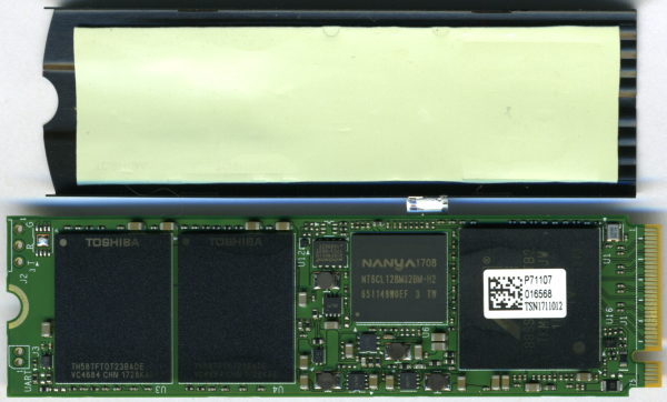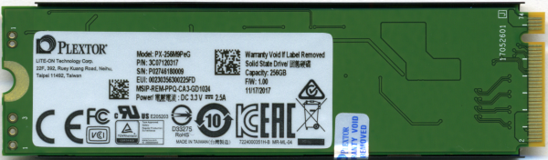 For the 256GB version of the M9Pe, Plextor used Toshiba's new 64-layer BiCS3 3D TLC NAND flash. Looking at the pictures above, you can see that there are two 128GB NAND flash packages on the top of the PCB. The drive also has a single NANYA 512MB LPDDR3 DRAM memory chip that is used for caching.