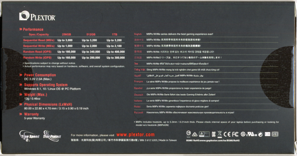 The M.2 2280 version of the M9Pe comes packaged in an eye catching black and rainbow colored box. In addition to a small, plastic window which lets you see what the drive looks like, the front advertises key features like its 256GB capacity, support for NVMe, advanced heat sink design and 5 year warranty. The back of the box provides a bit more information regarding the M9Pe's specifications and features.