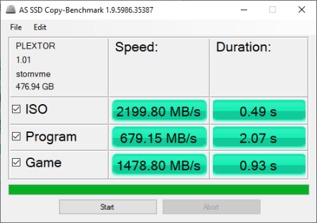 AS SSD also includes a copy benchmark. This test copies an ISO (two large files), program (many small files) and game (small and large files), returning the speed and duration of each.
