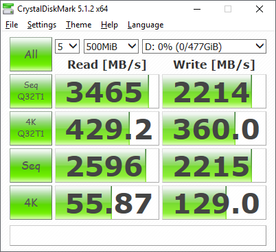 First, I ran a few quick tests using CrystalDiskMark. This benchmark tool measures the performance of a storage device by testing its sequential read and write speeds as well as its random read and write speeds using blocks 512K and 4K in size.
