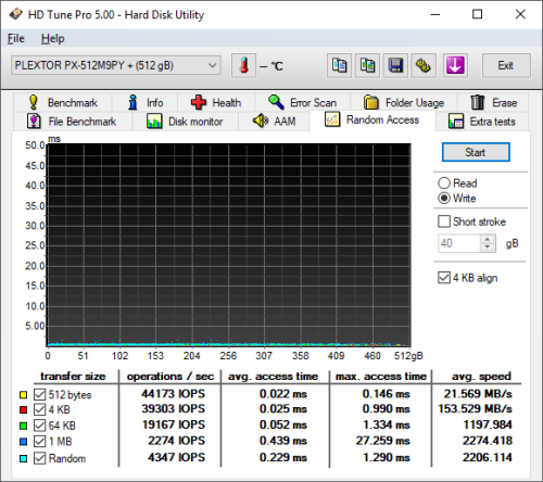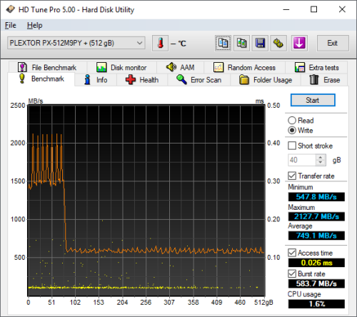 Next, I ran a series of tests using HD Tune Pro. This hard disk utility measures a drive's performance by testing its sequential read and write speeds as well as its access time, burst rate and CPU usage. For this review, I'm also going to use it to benchmark the Plextor M9PY Plus' random read and write speeds, random access times and the number of operations per second.