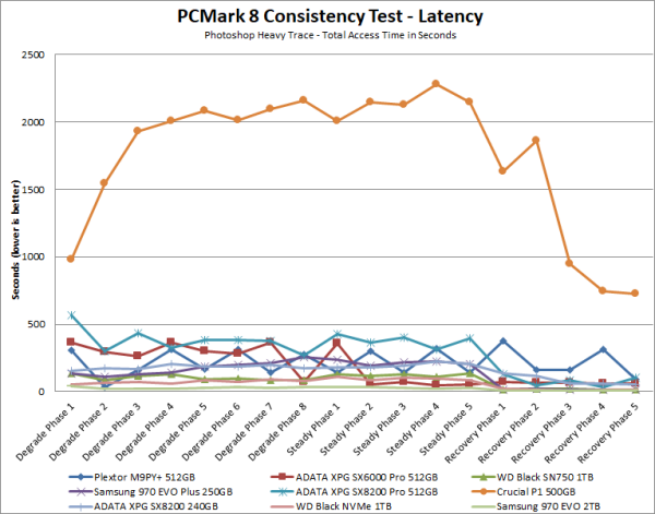 PCMark 8 also includes a consistency test which measures the performance consistency and degradation tendency of a storage system. The test reports the performance level at the start, the degraded steady-state and the recovered state as well as the number of iterations required to reach the degraded state and the recovered state. For this test, we are focusing on the Adobe Photoshop (Heavy) trace and will look at both the bandwidth and latency of the drive