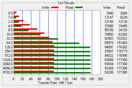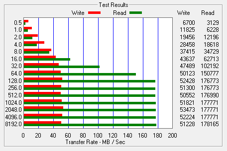 I also used ATTO Disk Benchmark to test the PX-128M1S's sequential read and write speeds. The tests are run using blocks ranging in size from 0.5KB to 8192KB and the total length set to 256MB.