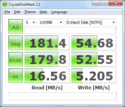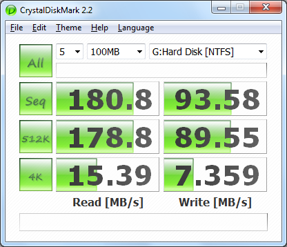 First, I ran a few quick tests using CrystalDiskMark. This benchmark tool measures the performance of a storage device by testing its sequential read and write speeds as well as its random read and write speeds using blocks 512K and 4K in size.