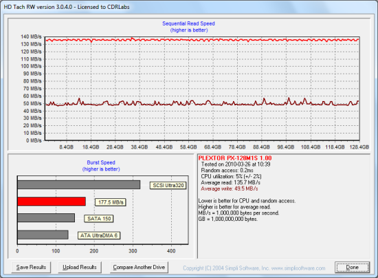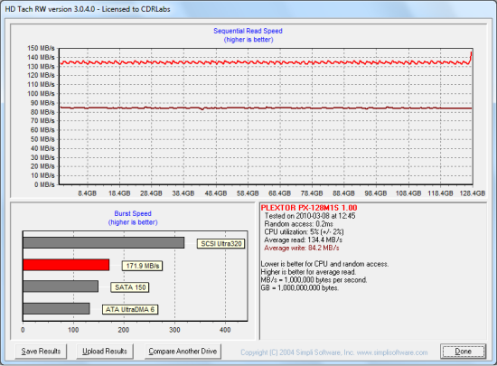 Next, I used HD Tach to test the PX-128M1S's read, write and burst speeds as well as its seek times and CPU usage.