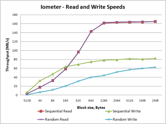 Lastly, I ran a series of tests using Iometer. This tool can be configured to benchmark a number of things. In this case, I used it to measure the PX-128M1S's read and write speeds and the number of operations per second. These tests were run using blocks ranging from 512B to 2MB in size.