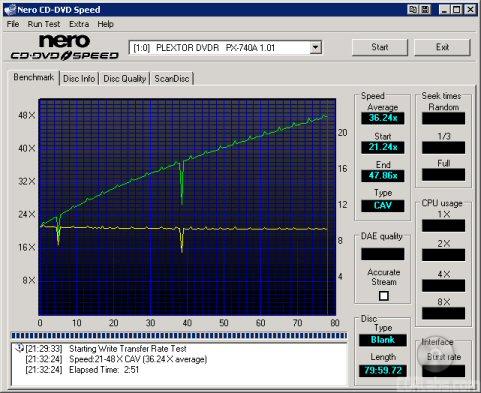 The PX-740A performed pretty well here. While not as fast as some of the other drives when writing to DVD-R discs at 16x, it turned in some very good times with DVD+R and DVD-RW media.