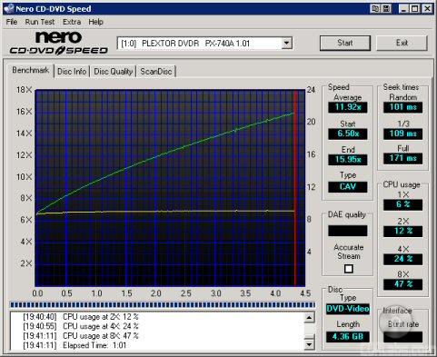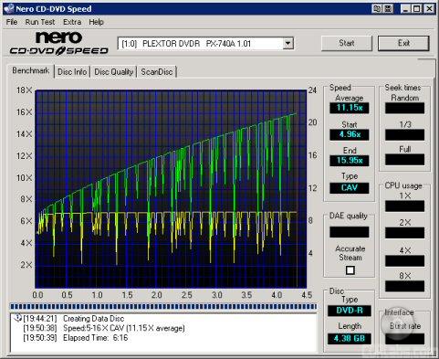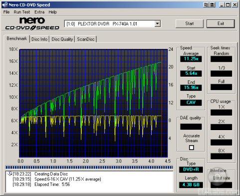 When writing to DVD+R and DVD-R media at 16x, the PX-740A uses CAV. By looking at the screenshots above, you can see that Plextor's new drive starts writing at about 5.6x and accelerates, reaching its maximum speed as it reaches the end of the disc.