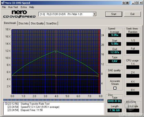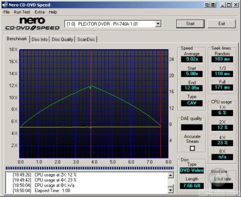 The PX-740A didn't slow down very much when reading single layer DVD videos. It started out at about 6.50x and reached a maximum read speed of 15.95x. Plextor's new drive was also fairly quick when reading dual layer discs. By looking at the screenshot below, you can see that the drive's transfer speeds peaked at about 8x.