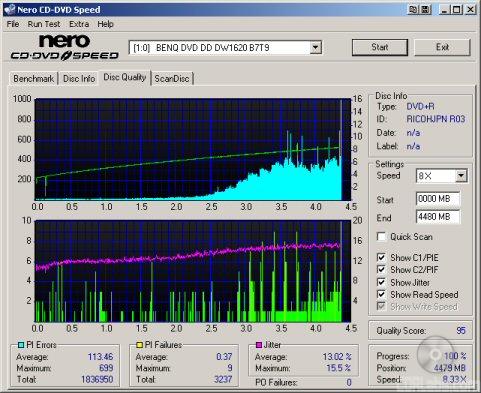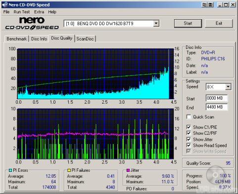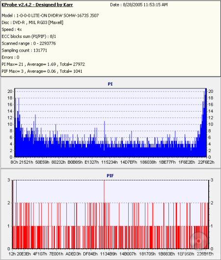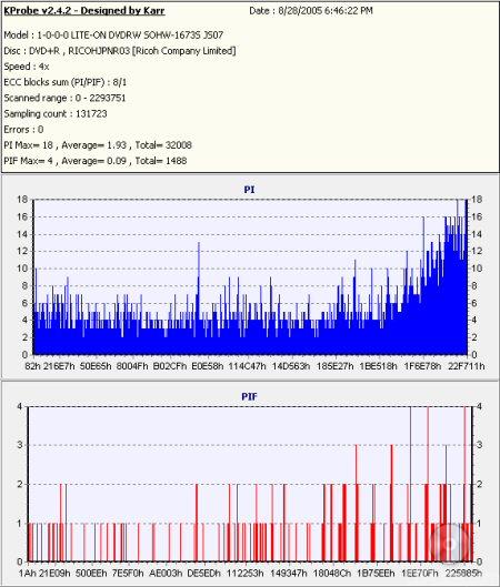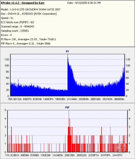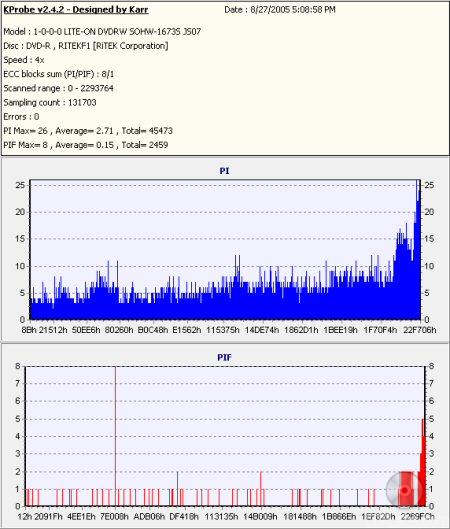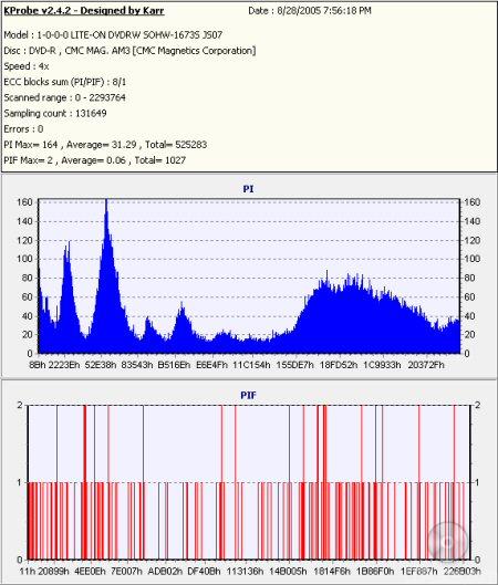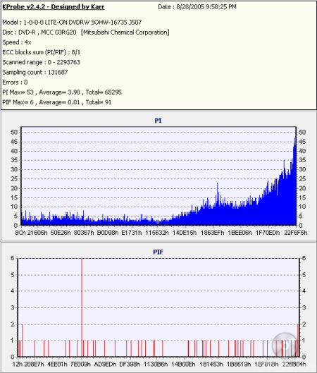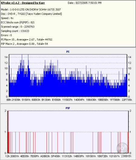 So what about writing quality? Testing a drive's DVD writing quality isn't easy. Until now, there were very few options, unless you wanted to shell out thousands of dollars for a certified test machine. Thanks to KProbe, we can test a disc's PI (Parity Inner) and PIF (Parity Inner Fail) rates.For these tests I used a Lite-On SOHW-1673S (firmware JS07) and read the discs at 4x with the PI and PIF ECC sums set to 8 and 1 respectively. For comparison, I also tested the discs on a BenQ DW1620. When combined with Nero CD Speed, the DW1620 is able to report PI Errors, PI Failures, Parity Outer Failures and even jitter levels. For this test, the discs are read at 8x with both the PI and PIF ECC sums set to 8.