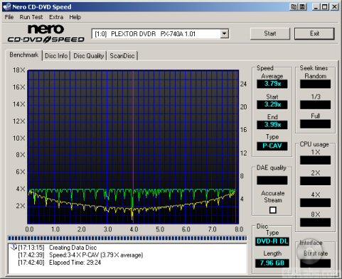 According to Plextor, the PX-740A writes to DVD+R DL media at 8x. Using CD Speed, we can see that the drive uses P-CAV to reach this speed. It starts rewriting at about 6x and accelerates, reaching its maximum speed at about the 0.5GB mark. It writes at this speed until it reaches the 7.5GB mark. At this point, the PX-740A slows back down to about 6x.