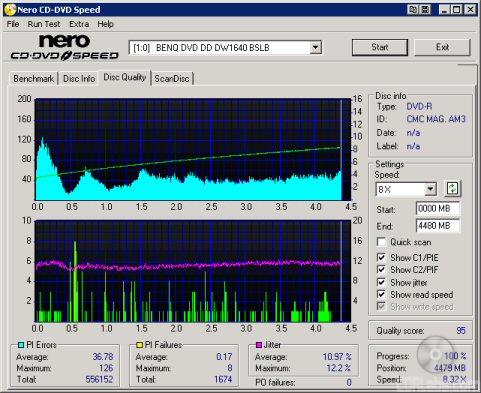 So what about writing quality? Testing a drive's DVD writing quality isn't easy. Until now, there were very few options, unless you wanted to shell out thousands of dollars for a certified test machine. Thanks to KProbe, we can test a disc's PI (Parity Inner) and PIF (Parity Inner Fail) rates.For these tests I used a Lite-On SOHW-1673S (firmware JS07) and read the discs at 4x with the PI and PIF ECC sums set to 8 and 1 respectively. For comparison, I also tested the discs on a BenQ DW1640. When combined with Nero CD Speed, the DW1640 is able to report PI Errors, PI Failures, Parity Outer Failures and even jitter levels. For this test, the discs are read at 8x with both the PI and PIF ECC sums set to 8.