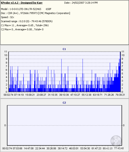 The first function of Q-Check is to measure the number of C1/C2 errors on a CD. After clicking the Start button, the test will begin. The graph you see represents the C1 error measurement (BLER or BLock Error Rate) and C2 error measurement (E22).