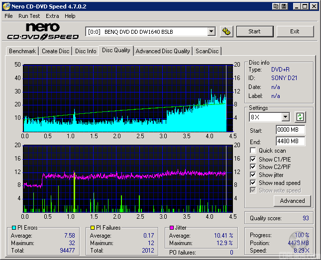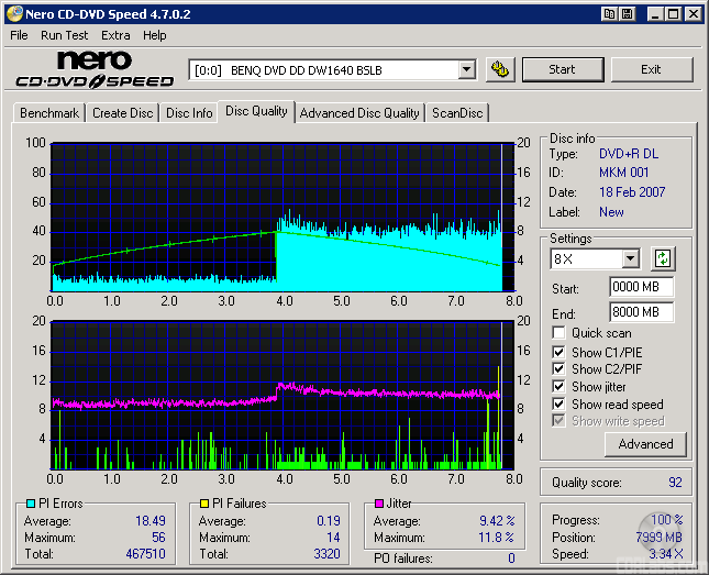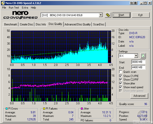 For comparison, I also tested the discs on a BenQ DW1640. When combined with Nero CD Speed, the DW1640 is able to report PI Errors, PI Failures, Parity Outer Failures and jitter levels. For this test, the discs are read at 8x with both the PI and PIF ECC sums set to 8.