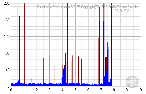 With Nero, it took the PX-755UF about 15:11 to write 8001MB of data. While faster than the drives from ASUS and Lite-On, it was more than a minute slower than the GSA-H10N. So what about writing quality? Take a look below.